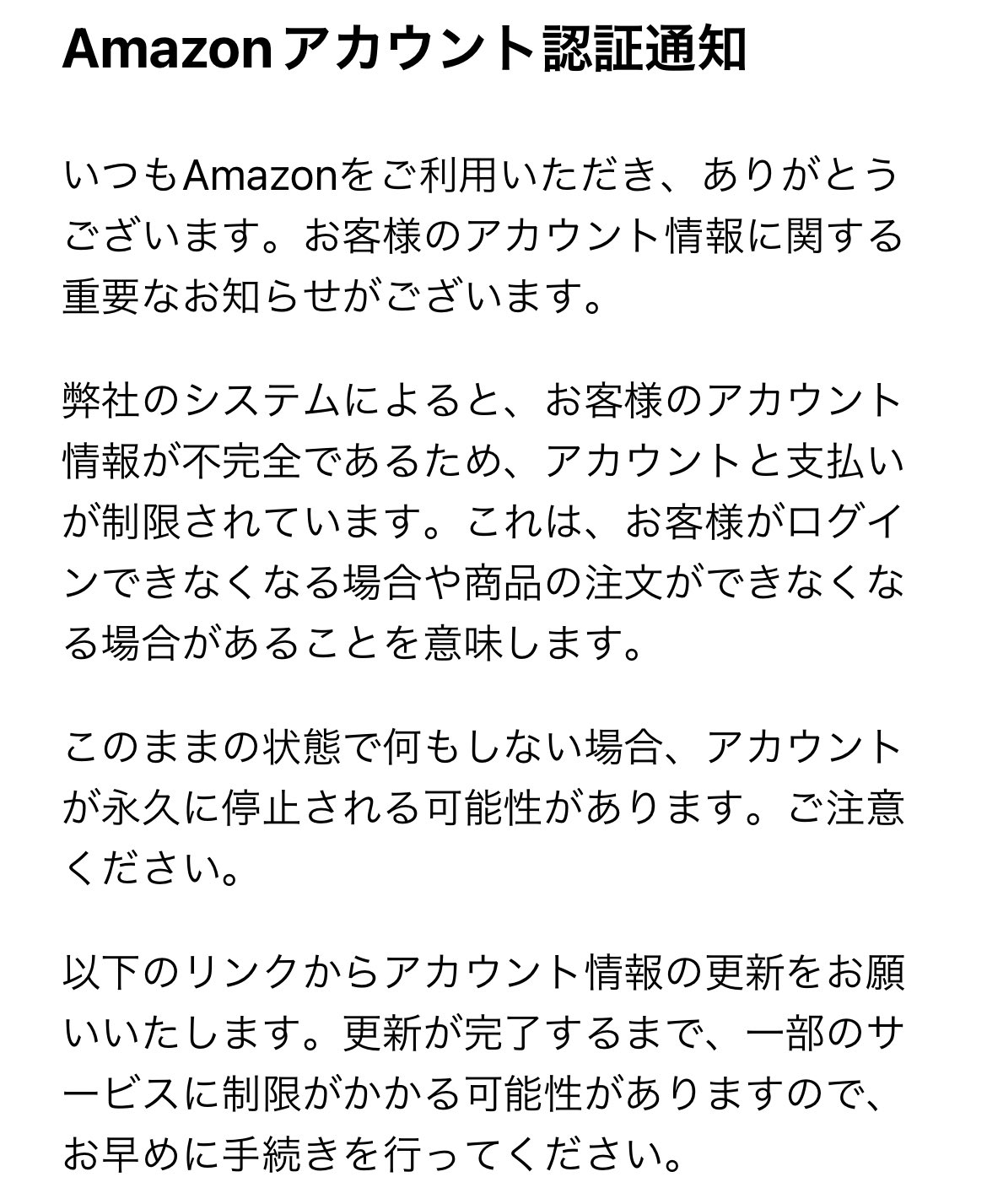 Amazonをご利用いただき誠にありがとうございます。 システムによる定期的なチェックの結果、 お客様のアカウントについて再認証が必要となりました。