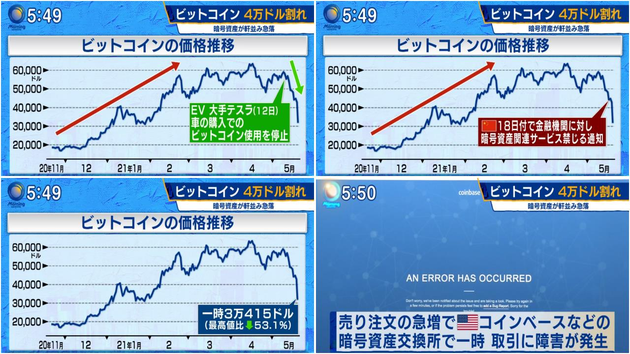 イーサリアムなど他の仮想通貨も軒並み急落した。ビットコインは午前10時すぎの急落以降は買い戻す動きも出て、一時4万ドル台まで戻すなど、荒い値動きが続いた。
