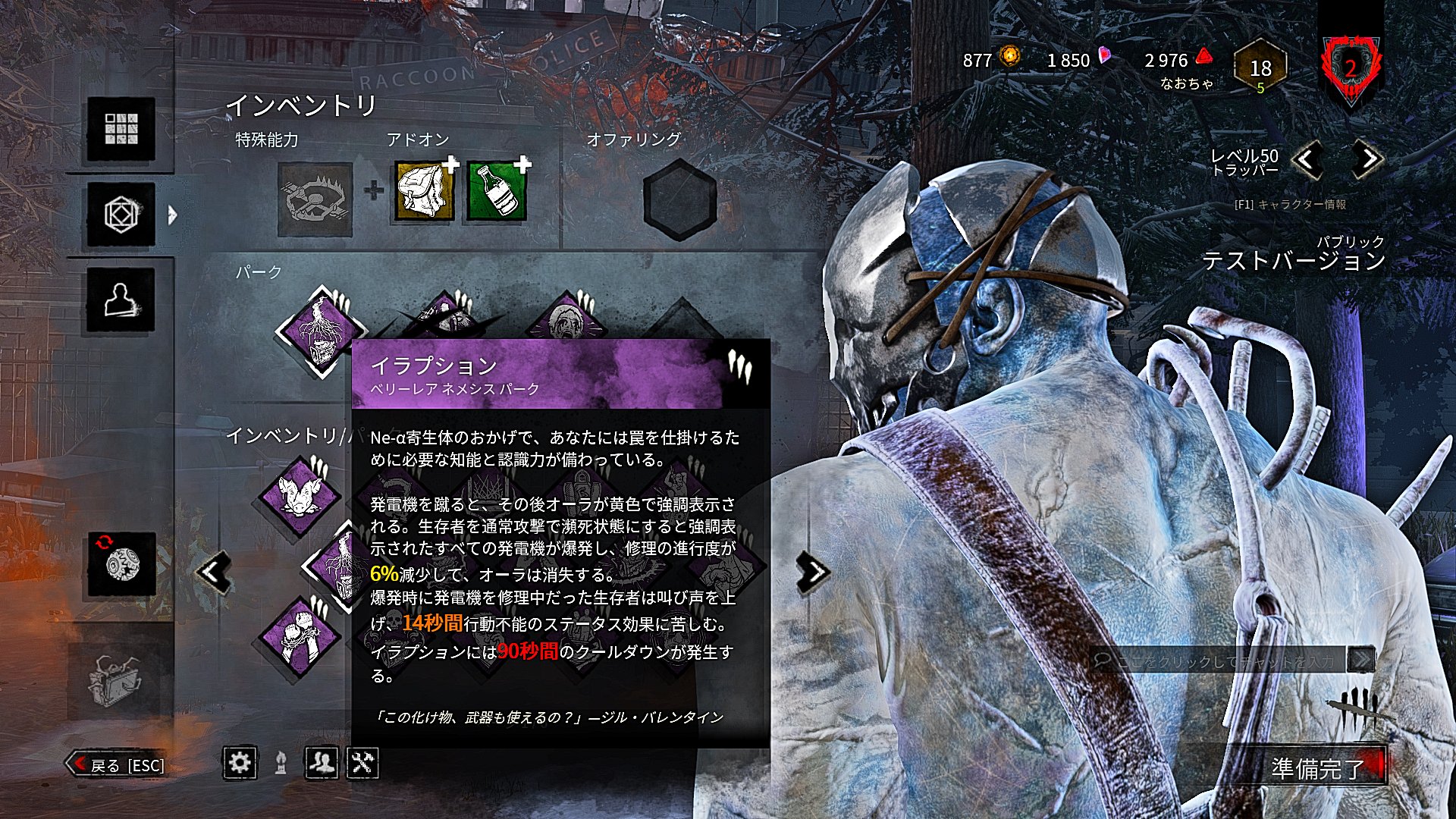 (…ネメシスのパークどれも微妙の予感。ヒステリーが能力攻撃でも発動するか、負傷者をダウンさせても発動するならマシになりそうなんですが)