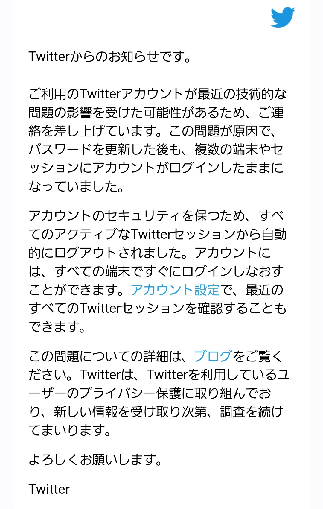 ご利用のTwitterアカウントが最近の技術的な問題の影響を受けた可能性があるため、 ご連絡を差し上げています。