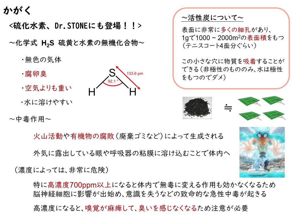 Dr.STONE(ドクターストーン)で硫化水素の濃い地帯だと、硫化水素は空気よりも重く地表近くにたまることから