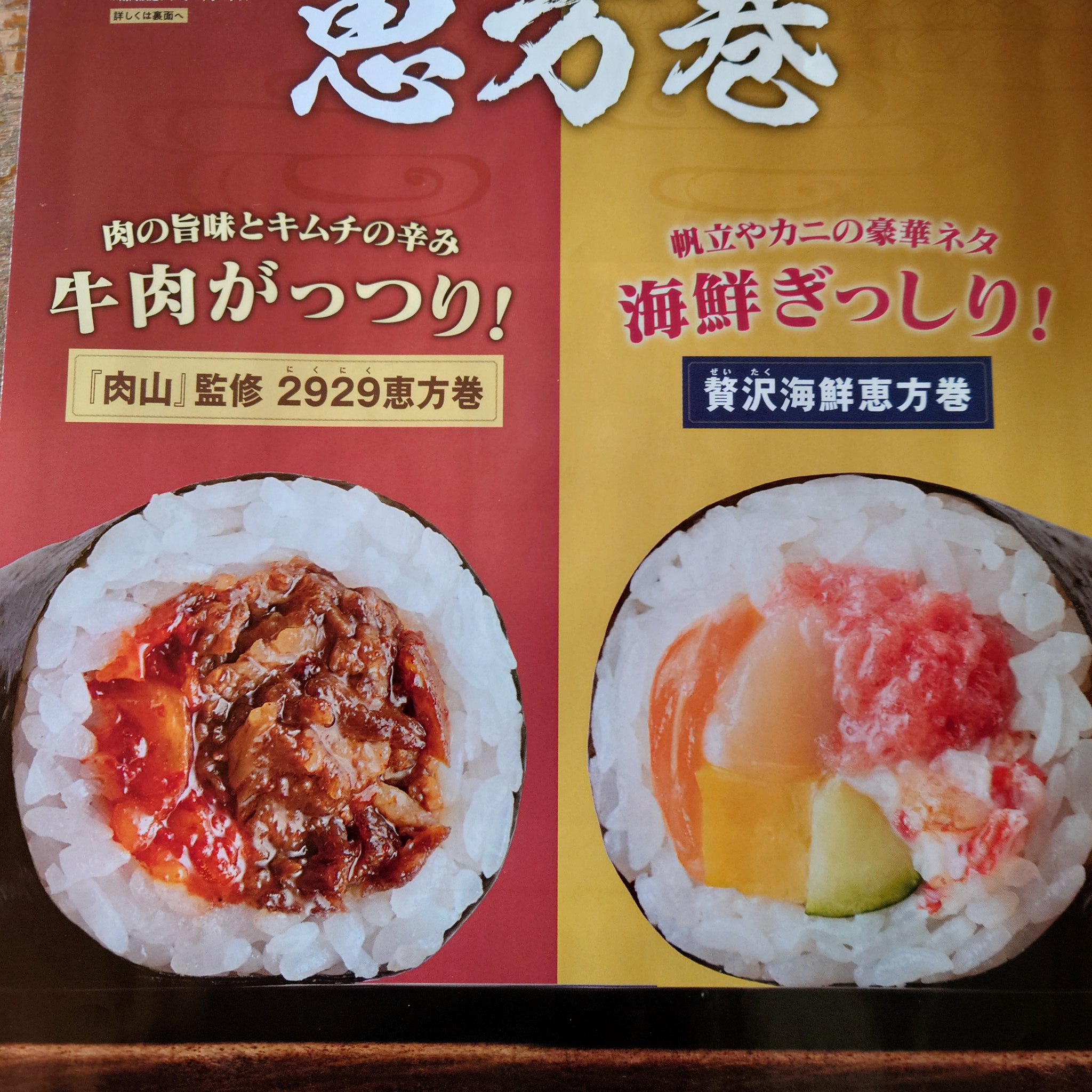 恵方巻6種類とスイーツ4種類を用意した。沖縄県ではスイーツは3種類。発売は、「なだ万監修 特上恵方巻」「肉山監修 2929恵方巻」「贅沢海鮮恵方巻」「恵方巻」「海鮮恵方巻」「サラダ恵方巻」の恵方巻6種類、スイーツは「節分 生チョコクレープ」「節分 塩豆大福(2個入)」「節分 7種のフルーツロール」「節分 ほどけるくちどけロールケーキ(抹茶&チョコ)2本入」の4種類。