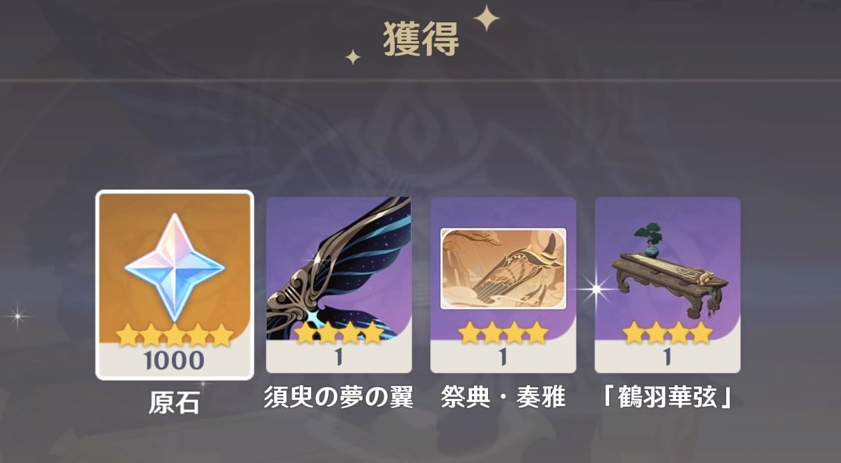 特典風の翼「須臾の夢の翼」と特典名刺「祭典・奏雅」をすでに所持している旅人さんがパックを再び獲得した場合、原石と特典調度品「鶴羽華弦」のみを獲得できます。