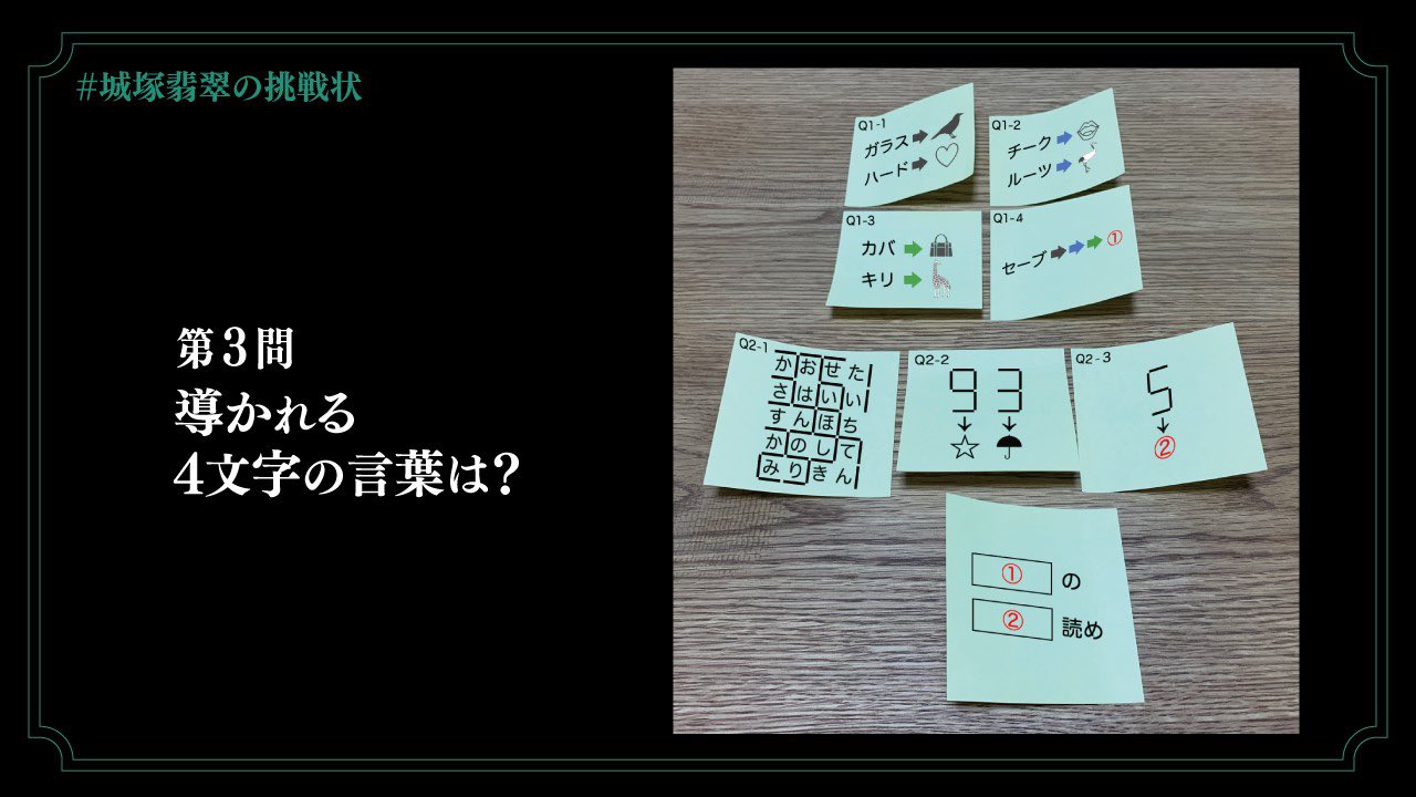 ドラマ『霊媒探偵・城塚翡翠』では『城塚翡翠からの挑戦状』として謎解きが出題されています。