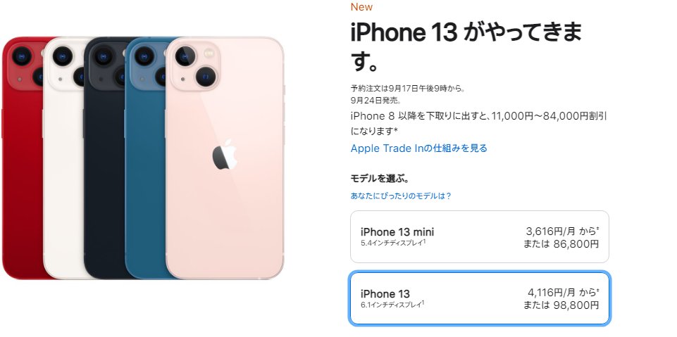 「iPhone 13」のアップルオンラインでの価格は、128GBモデルが98,800円、256GBモデルが110,800円、512GBモデルが134,800円。