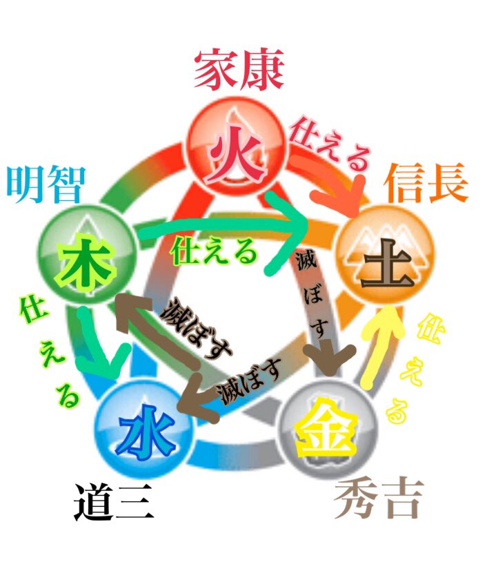 水(水行) 泉から涌き出て流れる水が元となっていて、これを命の泉と考え、胎内と霊性を兼ね備える性質を表す。「冬」の象徴。