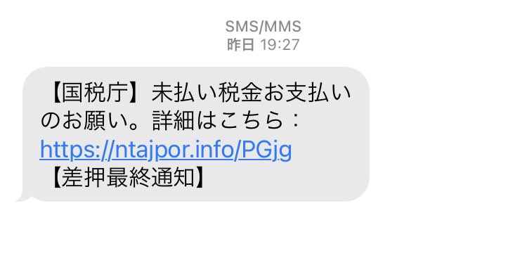 SMSで「あなたの国税は納期限を経過したが、完納していません。速やかに完納してください。」というメッセージは国税庁を騙る詐欺メールです。