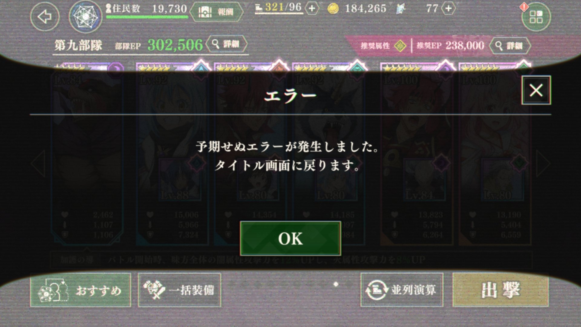 並列演算を実行するにはそのクエストの評価3つを全て達成し、推奨EP以上のEPを確保する必要がありますが、エラーが発生し落ちるバグが続出しています。