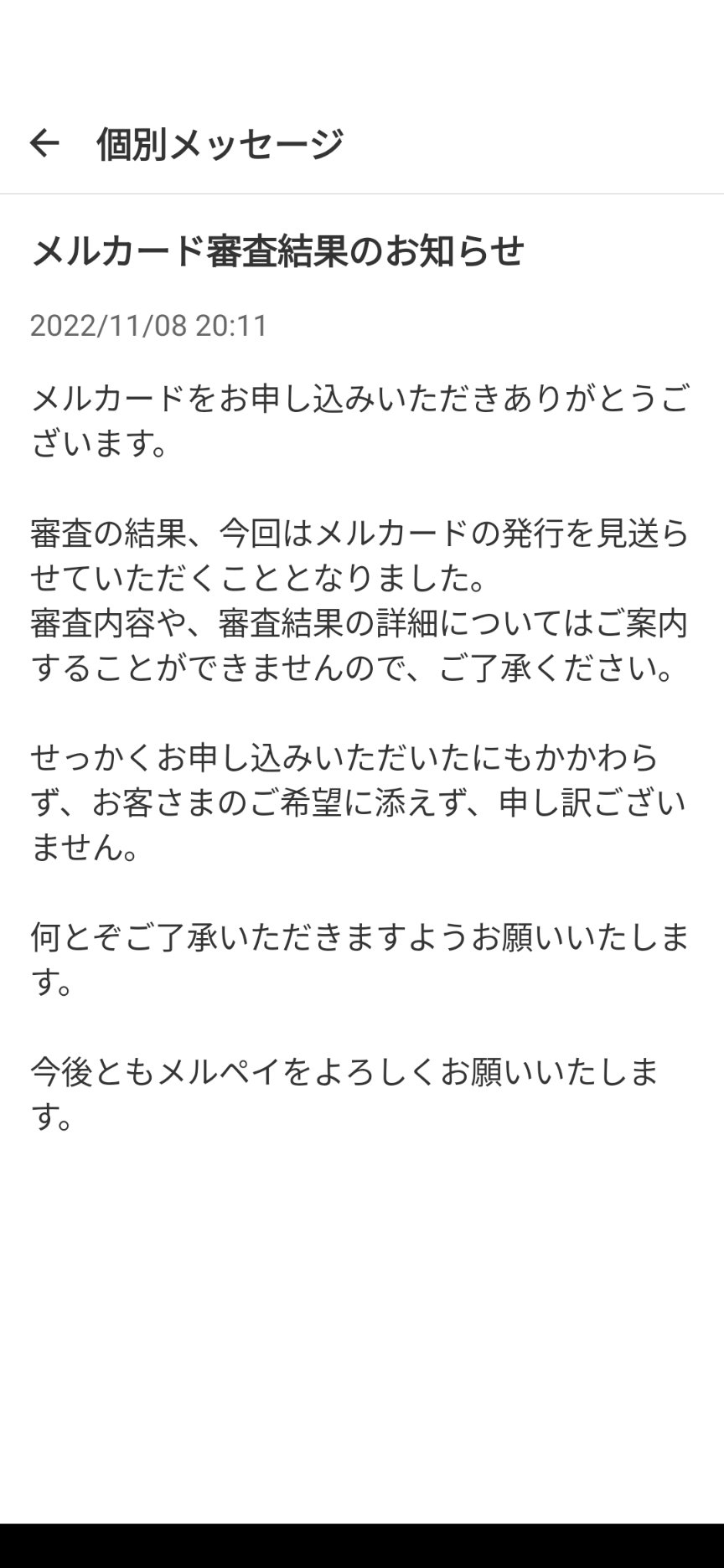 どうやら、メルカードで審査落ちの場合にはその旨のメールが配信されるようなので、そのメールが来ていない以上、審査通過とみて良さそうです。