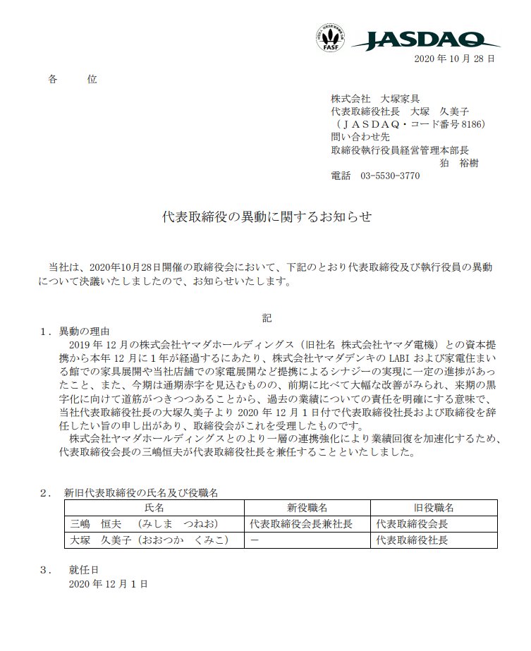 辞任後も大塚久美子社長は、昨年12月に資本提携した(株)ヤマダホールディングス(旧:(株)ヤマダ電機、TSR企業コード:270114270)や大塚家具を外部からサポートしていく。また、大塚家具の担当者によると、「大塚家具」の社名は変更しない方針という。