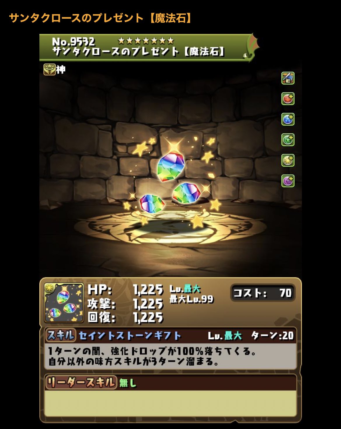 1ターンの間、強化ドロップが100%落ちてくる。自分以外の味方スキルが3ターン溜まる。(25→20)