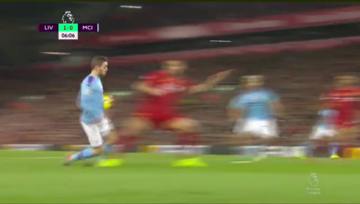 アーノルドがハンドと判定される前にマンチェスターシティのMFベルナルド・シウバの腕が、