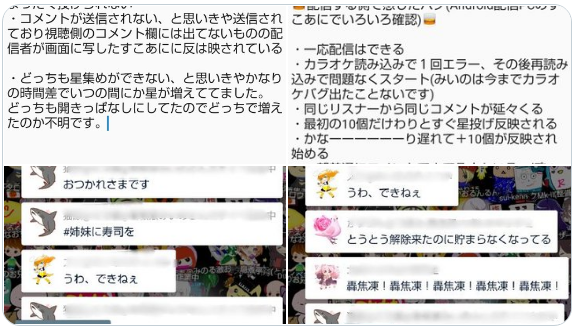 ・コメントが送信されない、と思いきや送信され ており視聴側のコメント欄には出てないものの配 信者が画面に写したすこあにに反は映されている