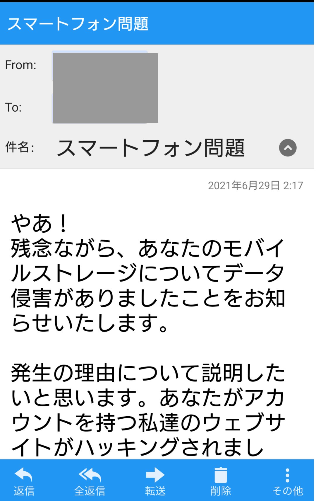 ただ送信元メールアドレスが宛先メールアドレスになるよう偽装されいるため、あまり知識のない人にしてみたら自分のメールアカウントから乗っ取られたと不安を感じるかもしれません。