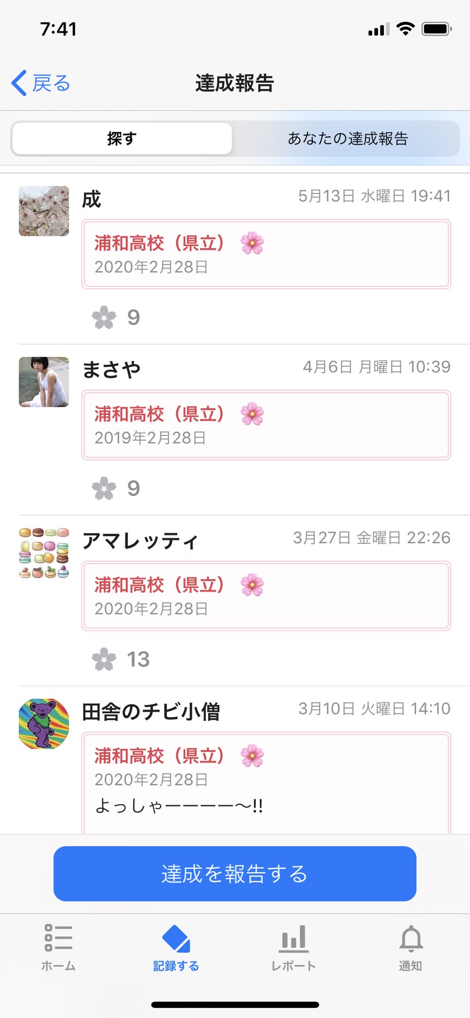 「達成報告」は左上にある自分のアカウントのアイコンをタップすると、左の真ん中の辺りに出てくると思います。