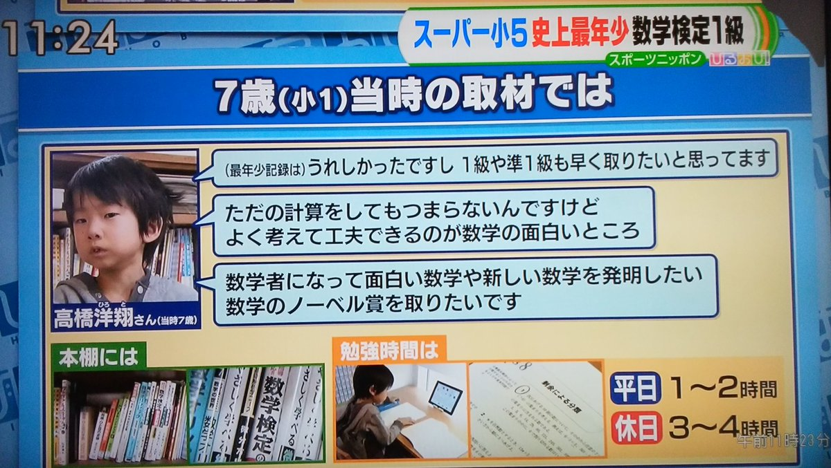 高橋洋翔さんは当時としては史上最年少で数学検定2級、そして数学検定1級を獲得してしまったスーパー小学生。