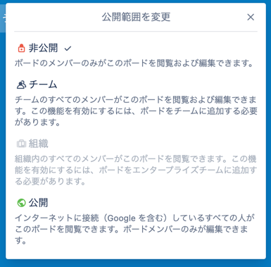 Trelloではボードのプライバシー設定(公開範囲)を「非公開」「チームに公開」「公開」の3つから選ぶことができます。
